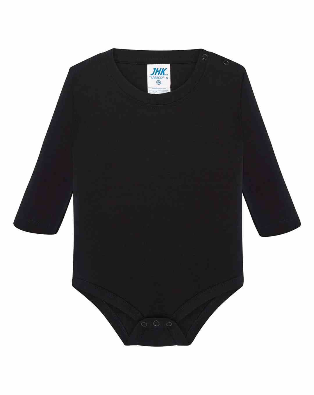 Body dziecięce z długim rękawem. Wykończenie pod szyją - lycrą. Zapinane na ramieniu i w kroku. Ściągacz 1x1. 100% bawełna.