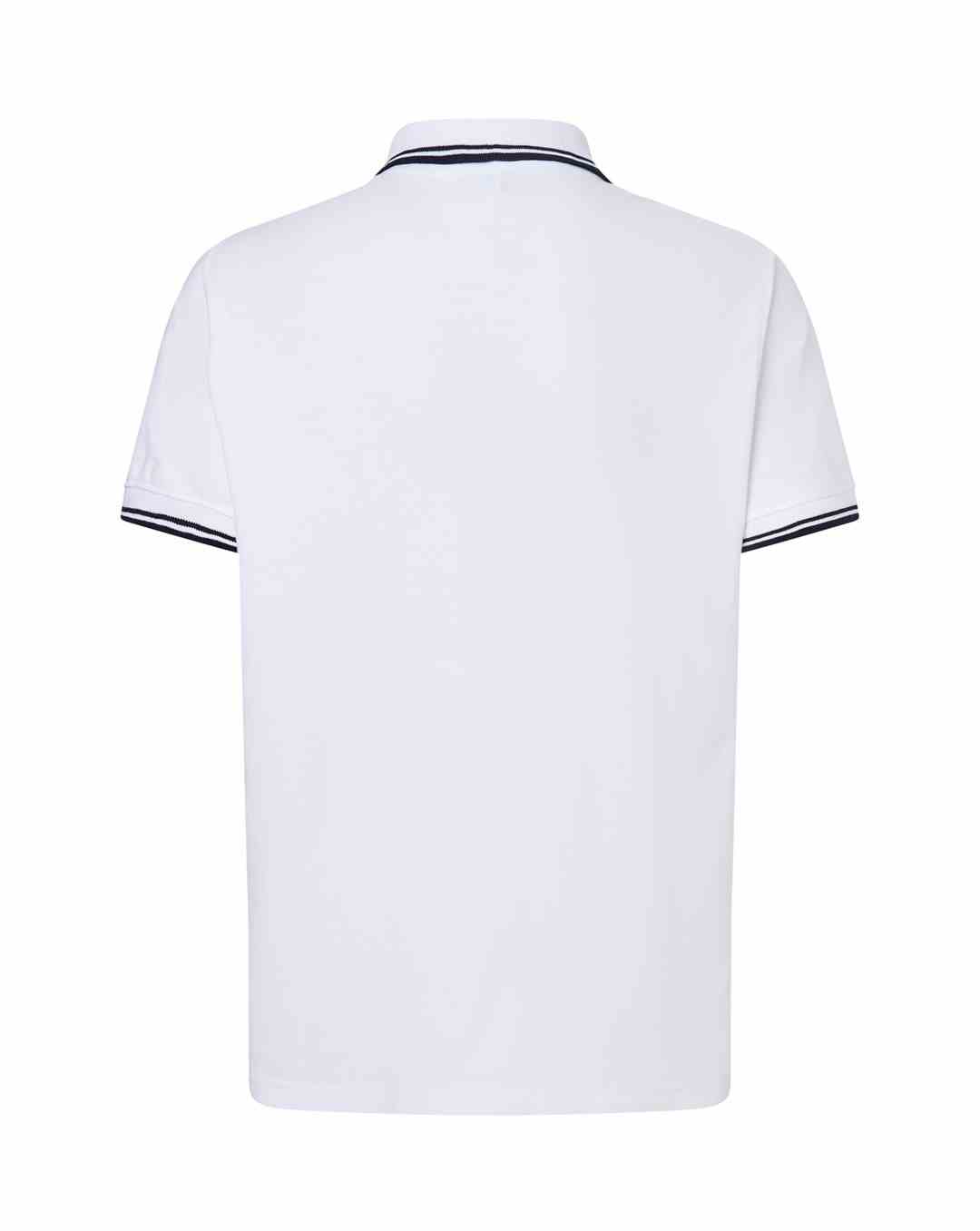 Polo męskie z krótkim rękawem. Zapinane na dwa guziki. Kołnierzyk i rękawy wykończone dzianiną 1x1. Boczne rozcięcia. 100% stabilizowana bawełna czesankowa pique.