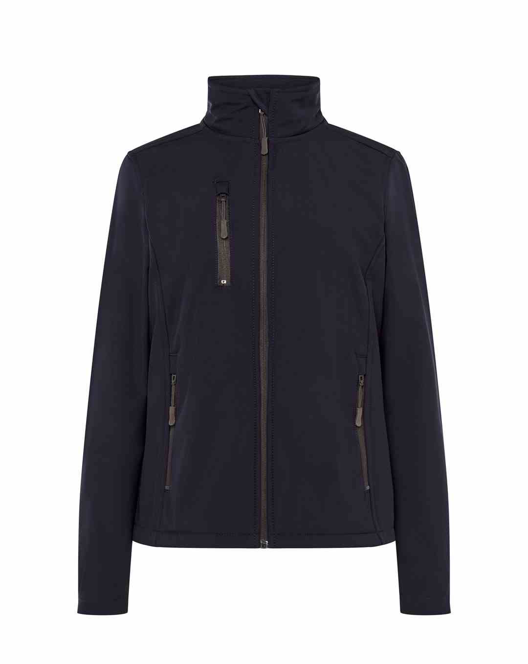 Kurtka damska typu softshell. Długi zamek. Kieszenie boczne. Waterproof 3000mm, breathability 3000mvp, windstop. Ext: 95% poliester / 5% elastan; Int:100% poliester
