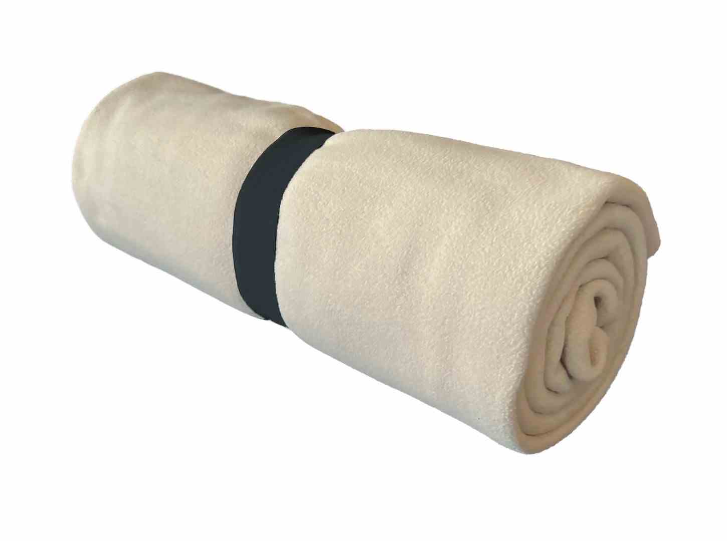 Koc wykonany z grubego polaru, gładkie nie obszywane brzegi koca, elastyczna guma zabezpieczająca przed rozwinięciem.
