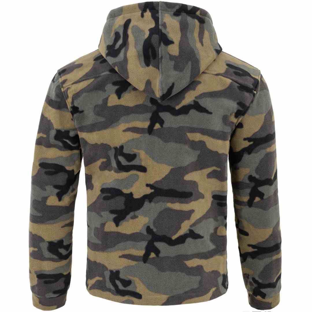 Bluza polarowa z odpianym kapturem. Polar z wykończeniem antypilingowym. Polar jest gruby i posiada bardzo dobre właściwości cieplne, przyjemny w dotyku, 2 kieszenie zasuwane zamkami błyskawicznymi oraz dodatkowa kieszeń na piersi z zamkiem. W dolnej częśći możliwa regulacja na gume ze stoperami. Bluza w kolorze Camuflage. Możliwe zastosowanie dowolnej kolorystyki i łączenia kolorów w produkcje: FLRA 340 PREMIUM Dowolna Kolorystyka od 30 szt