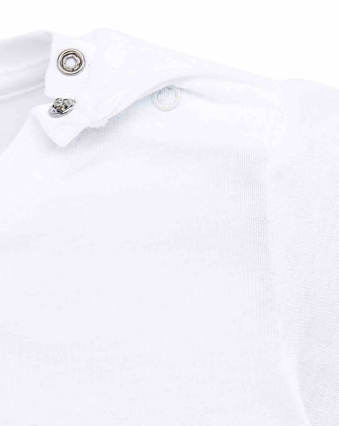 Body dziecięce z krótkim rękawem. Wykończenie pod szyją - lycrą. Zapinane na ramieniu i w kroku. Ściągacz 1x1. 100% bawełna.
