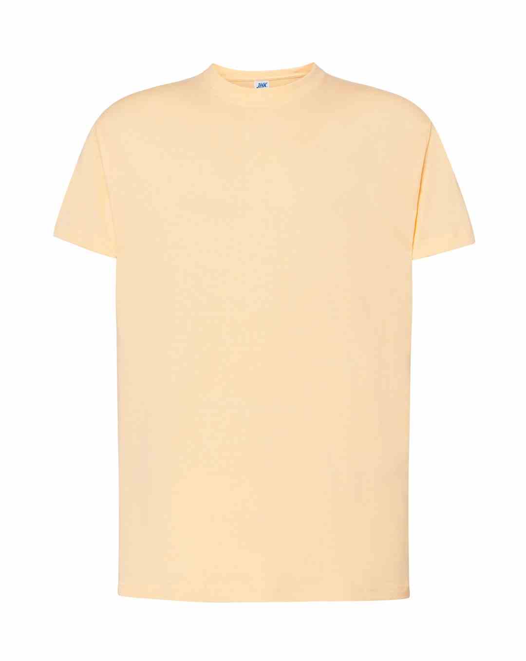 T-shirt męski z krótkim rękawem. Brak bocznych szwów. Podwójne szwy na ramionach. Wzmocniony lycrą ściągacz. Taśma wzmacniająca. 100% bawełna stabilizowana.